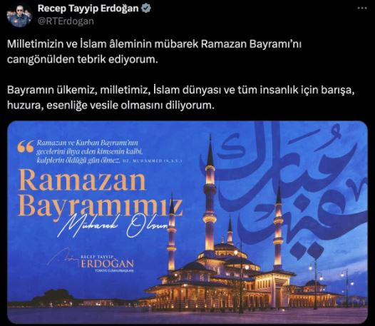 Paylaşımında tüm İslam aleminin Ramazan Bayramı'nı tebrik etti.