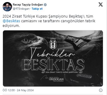 Cumhurbaşkanı Erdoğan, sosyal medya hesabından yaptığı paylaşımda, "2024 Ziraat Türkiye Kupası Şampiyonu Beşiktaş'ı, tüm Beşiktaş camiasını ve taraftarını canı gönülden tebrik ediyorum." ifadesini kullandı.