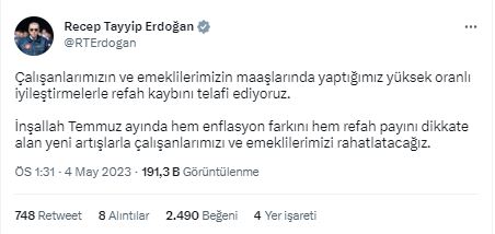 Cumhurbaşkanı Erdoğan sosyal medya hesabından yaptığı açıklamada "Çalışanlarımızın ve emeklilerimizin maaşlarında yaptığımız yüksek oranlı iyileştirmelerle refah kaybını telafi ediyoruz.