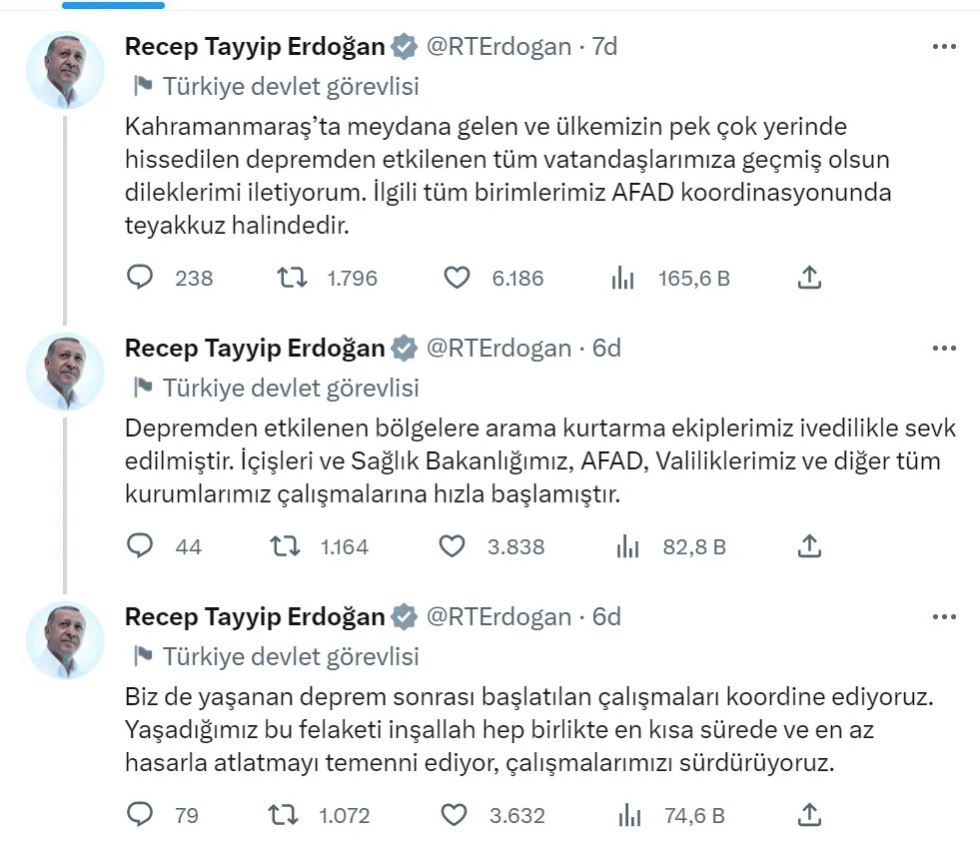 Kahramanmaraş'ın Pazarcık ilçesinde meydana gelen 7.4'lük depremin ardından Cumhurbaşkanı Recep Tayyip Erdoğan, Kahramanmaraş Valisi Ömer Faruk Coşkun'u arayarak bilgi aldı. Başkan Erdoğan, depreme ilişkin sosyal medya hesabından şu açıklamalarda bulundu: