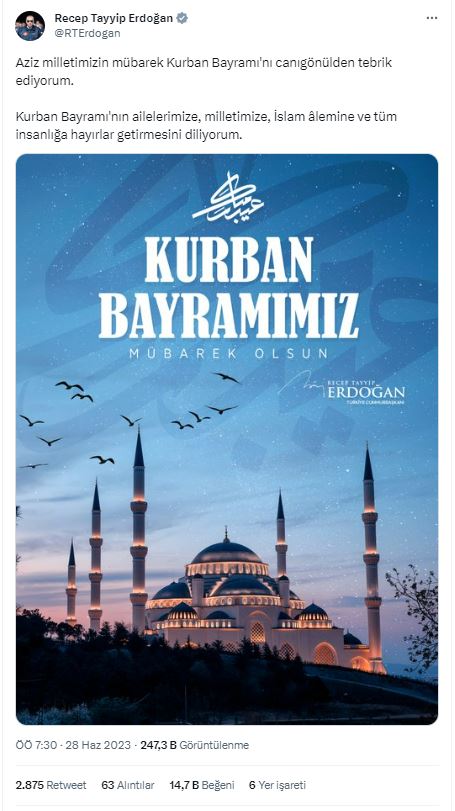 Erdoğan paylaşımında: " Aziz milletimizin mübarek Kurban Bayramı'nı canı gönülden tebrik ediyorum. Kurban Bayramı'nın ailelerimize, milletimize, İslam âlemine ve tüm insanlığa hayırlar getirmesini diliyorum." ifadelerine yer verdi. (Emre Gençleşen)