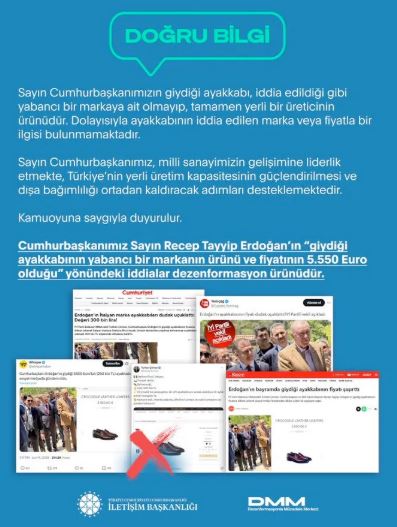 "Cumhurbaşkanımız Sayın Recep Tayyip Erdoğan’ın 'giydiği ayakkabının yabancı bir markanın ürünü ve fiyatının 5.550 Euro olduğu' yönündeki iddialar dezenformasyon ürünüdür. Sayın Cumhurbaşkanımızın giydiği ayakkabı, iddia edildiği gibi yabancı bir markaya ait olmayıp, tamamen yerli bir üreticinin ürünüdür. Dolayısıyla ayakkabının iddia edilen marka veya fiyatla bir ilgisi bulunmamaktadır."