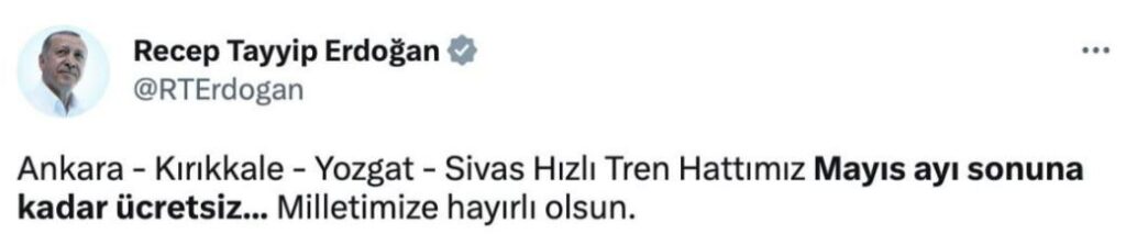 Bugün hizmete açılan Ankara-Sivas hızlı tren hattı ile ilgili sağlık sebeplerinden dolayı açılışa katılamayan Cumhurbaşkanı Recep Tayyip Erdoğan sosyal medya hesabından paylaşım yaptı.