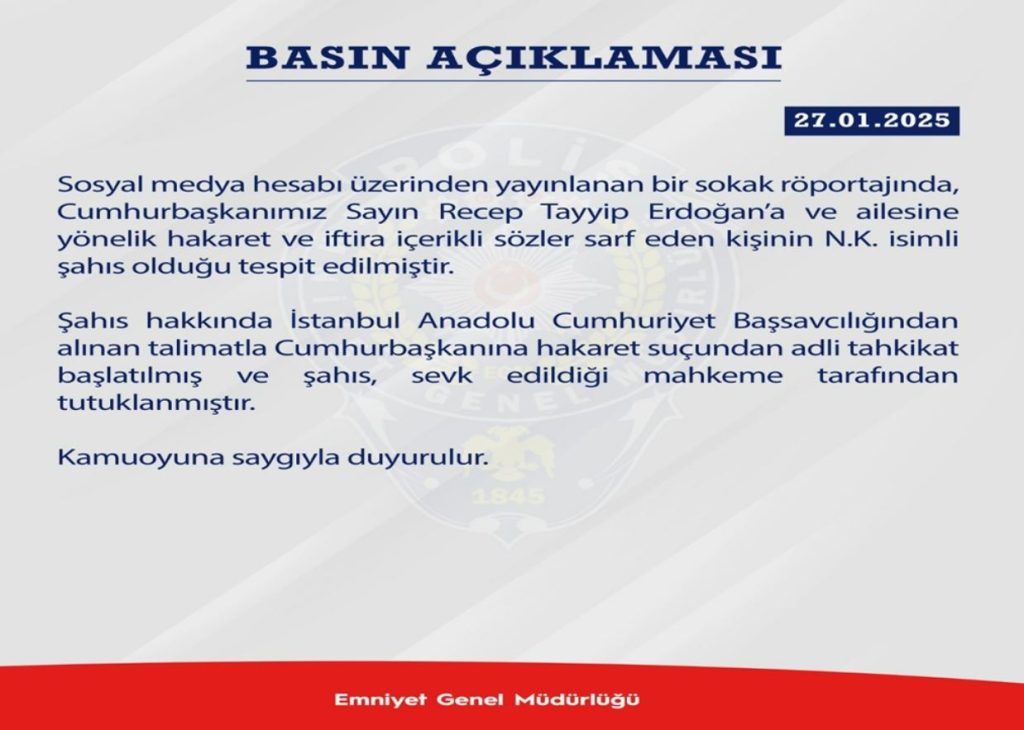 Emniyet Genel Müdürlüğü, sosyal medya hesabından yapılan paydaşımda, "Sosyal medya hesabı üzerinden yayınlanan bir sokak röportajında, Cumhurbaşkanımız Sayın Recep Tayyip Erdoğan'a ve ailesine yönelik hakaret ve iftira içerikli sözler sarf eden kişinin N.K. isimli şahıs olduğu tespit edilmiştir. Şahıs hakkında İstanbul Anadolu Cumhuriyet Başsavcılığından alınan talimatla Cumhurbaşkanına hakaret suçundan adli tahkikat başlatılmış ve şahıs, sevk edildiği mahkeme tarafından tutuklanmıştır" ifadeleri kullanıldı. (DHA)