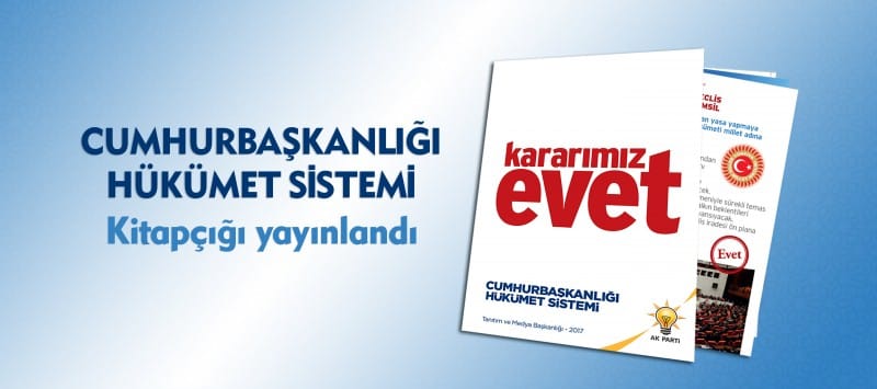 AK Parti'nin web sitesinde "Kararımız EVET" başlığıyla yayımlanan kitapçıkta Cumhurbaşkanlığı Hükümet Sistemi'nin genel faydaları, Cumhurbaşkanlığı Hükümet Sistemi'nin ne olduğu, anayasa değişiklik paketindeki maddelerin içeriği yer alıyor.