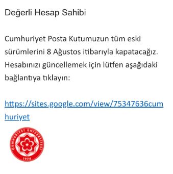 Paylaşılan görsellerde, "Değerli Hesap Sahibi" başlığıyla başlayan sahte e-postada, "Cumhuriyet Posta Kutumuzun tüm eski sürümlerini 8 Ağustos itibarıyla kapatacağız. Hesabınızı güncellemek için lütfen aşağıdaki bağlantıya tıklayın" ifadeleri yer alıyor. Mesaj içerisinde sahte bir Google Drive bağlantısı bulunurken, üniversitenin resmi logosu da kullanılarak inandırıcılık artırılmak isteniyor.