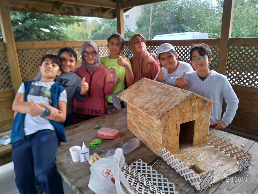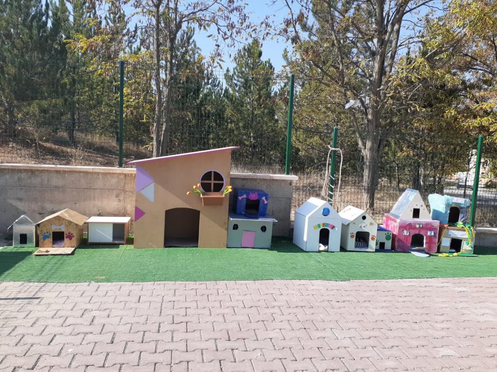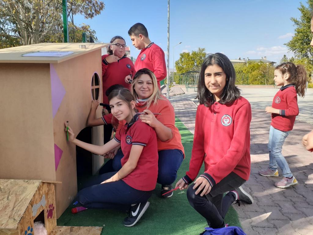 Ders öğretmenleri Zekiye Polat'ın rehberliğinde atık malzemelerin geri dönüşümü sonucunda sokak hayvanları için öğrenciler tarafından barınaklar inşaa edildi.