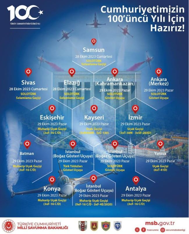 Türk Hava Kuvvetleri’ne ait muharip uçaklar, SOLOTÜRK ve Türk Yıldızları’nın gerçekleştirecekleri gösteri uçuşların yapılacağı iller şöyle: 28 Ekim Samsun, 28 Ekim Sivas, 29 Ekim Elazığ, 29 Ekim Ankara (Kahramankazan), 29 Ekim Ankara (Merkez), 29 Ekim Eskişehir, 29 Ekim Kayseri, 29 Ekim İzmir, 29 Ekim Batman, 29 Ekim İstanbul (Boğaz Gösteri Uçuşu), 29 Ekim Yalova, 29 Ekim Konya, 29 Ekim Antalya. (İHA)