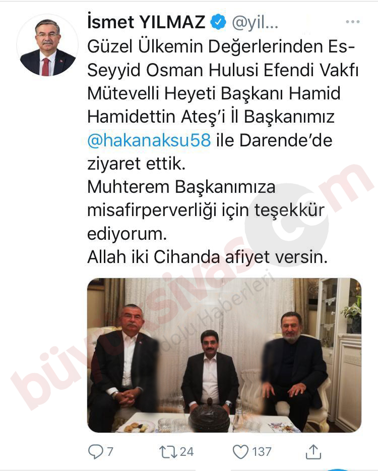 "Güzel Ülkemin Değerlerinden Es-Seyyid Osman Hulusi Efendi Vakfı Mütevelli Heyeti Başkanı Hamid Hamidettin Ateş'i İl Başkanımız @hakanaksu58 ile Darende'de ziyaret ettik. Muhterem Başkanımıza misafirperverliği için teşekkür ediyorum. Allah iki Cihanda afiyet versin."