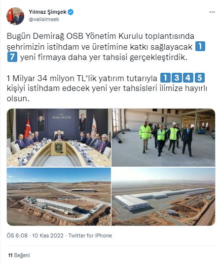 Sivas Valisi Dr. Yılmaz Şimşek başkanlığında yapılan Demirağ OSB yönetim kurulu toplantısında; 1 Milyar 34 milyon ₺ yatırım tutarıyla 1345 kişiyi istihdam edecek 17 yeni firmaya yer tahsisleri yapıldı.