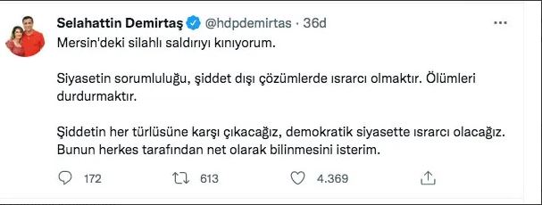 Eski HDP Eş Genel Başkanı Selahattin Demirtaş, MERSİN'de 1 polisin şehit olduğu, 2 teröristin öldüğü saldırıyı kınadı yine terör örgütü PKK'nın adını vermedi.