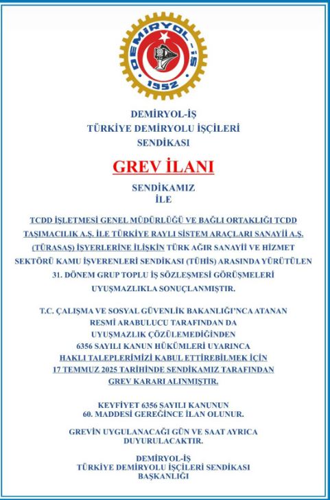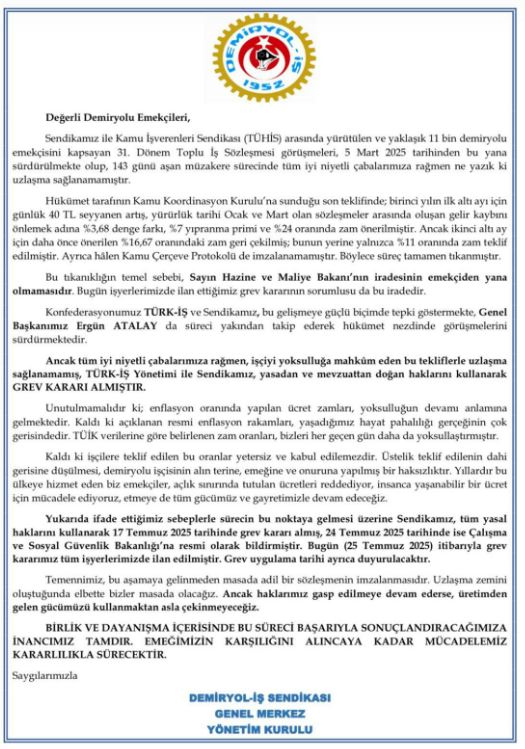 Demiryol-İş tarafından yayımlanan bildiride, “Yoksullukla mahkûm edilen demiryolu emekçilerine dayatılan bu teklifler kabul edilemez” denilerek, TÜRK-İŞ yönetimi ile birlikte anayasa ve yasalardan doğan hakların kullanılacağı ifade edildi. Grev kararı, 17 Temmuz 2025 tarihinde işyerlerine asıldı.