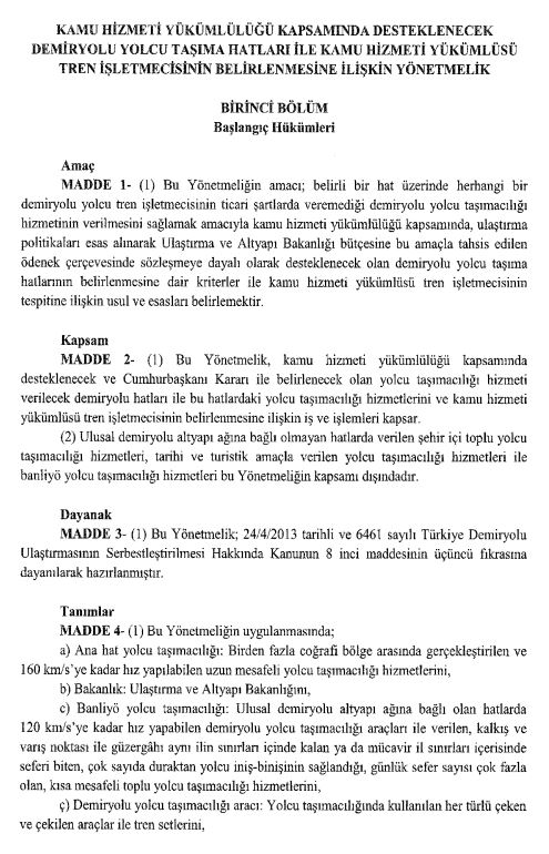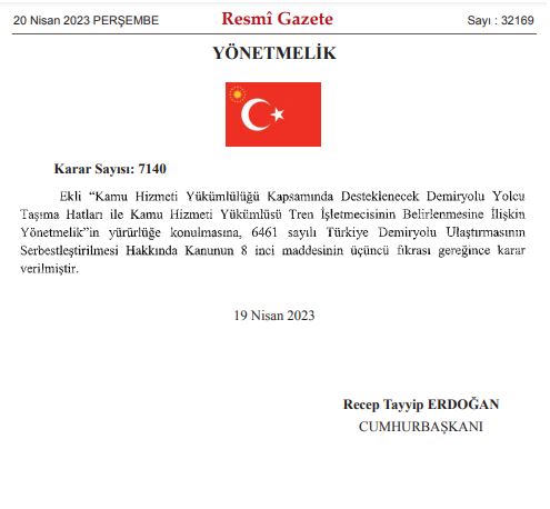 20 Nisan 2023 tarihli Resmi Gazete’de Cumhurbaşkanı Erdoğan’ın imzasıyla, “Kamu Hizmeti Yükümlülüğü Kapsamında Desteklenecek Demiryolu Yolcu Taşıma Hatları ile Kamu Hizmeti Yükümlüsü Tren İşletmecisinin Belirlenmesine İlişkin Yönetmelik”in yayımlanmasına karar verildi.