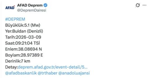 Denizli’de 5.1 Büyüklüğünde Deprem Çevre İllerde de Hissedildi.. Denizli’nin Buldan ilçesinde 5.1 büyüklüğünde deprem meydana geldi. Afet ve Acil Durum Yönetimi Başkanlığı (AFAD) tarafından yapılan açıklamada depremin çevre illerde de hissedildiği bildirildi.