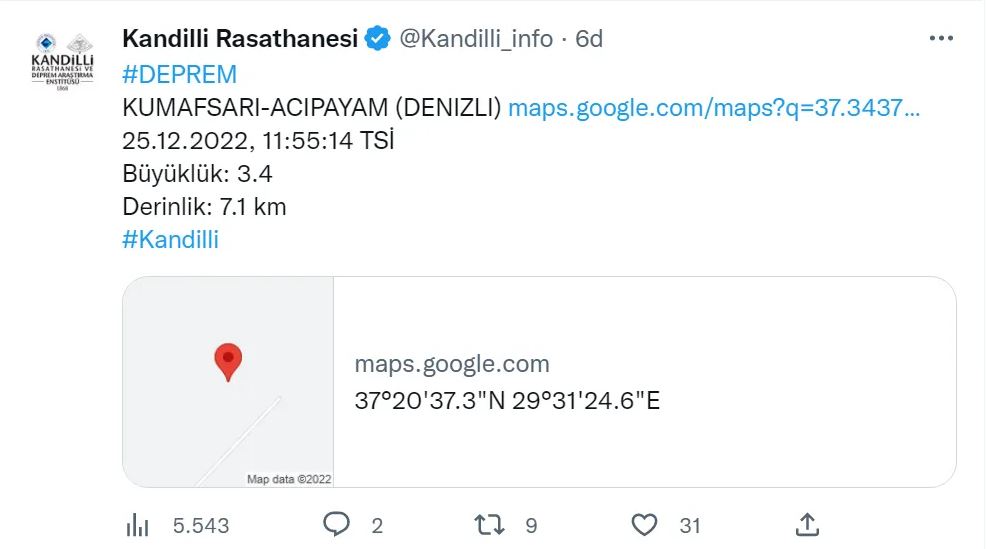 Denizli'de saat 11:55'te deprem oldu. Kandilli Rasathanesi'nden aktarılan bilgiye göre, merkez üssü Denizli'nin Acıpayam ilçesinde 3.4 şiddetinde deprem meydana geldi. Depremin yerin 7.1 km derinliğinde gerçekleştiği bildirildi.