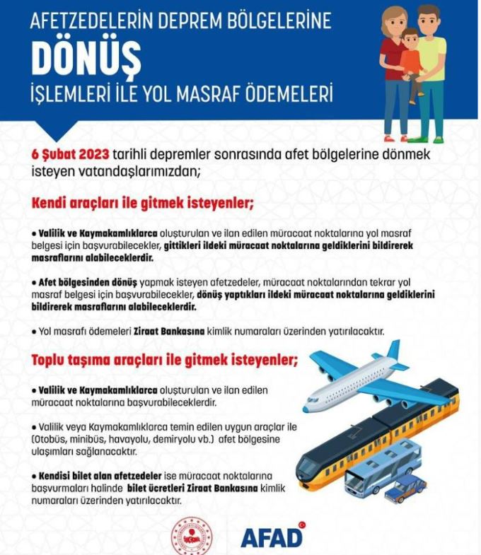 AFAD’ın duyurusuna göre, 6 Şubat tarihli depremler sonrasında afet bölgesine dönmek isteyen depremzede vatandaşlar kendi aracı ile gitmeleri halinde, Valilik ve Kaymakamlıklarca oluşturulacak ve ilan edilecek müracaat noktalarında yol masraf belgesi için başvurabilecekler. Gittikleri ildeki müracaat noktalarına ise geldiklerini bildirerek masraflarını alabilecekler. Yol masrafı ödemeleri ise Ziraat Bankasına kimlik numaraları üzerinden yapılacak.