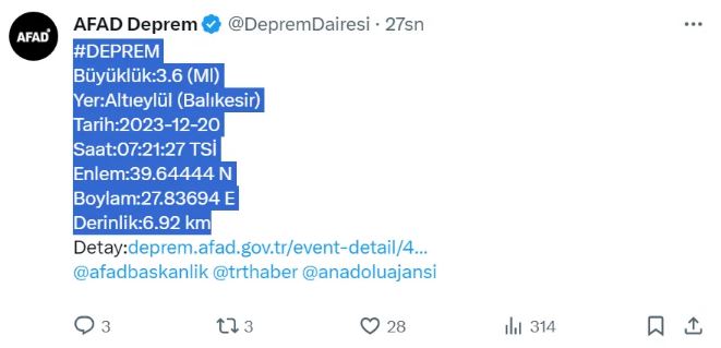 Deprem oldu. Türkiye yeni güne depremle uyandı. Balıkesir saat 07:21 sularında depremle sarsıldı. AFAD, Balıkesir'in merkezinde meydana gelen depremin şiddetini 3.6 olarak açıkladı.