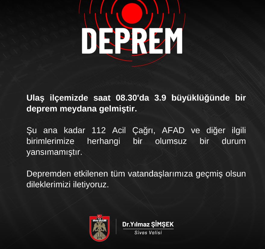 Deprem sonrasında Sivas Valiliği sosyal medya hesabından "Geçmiş Olsun Ulaş" başlığıyla bir açıklama yaptı.
