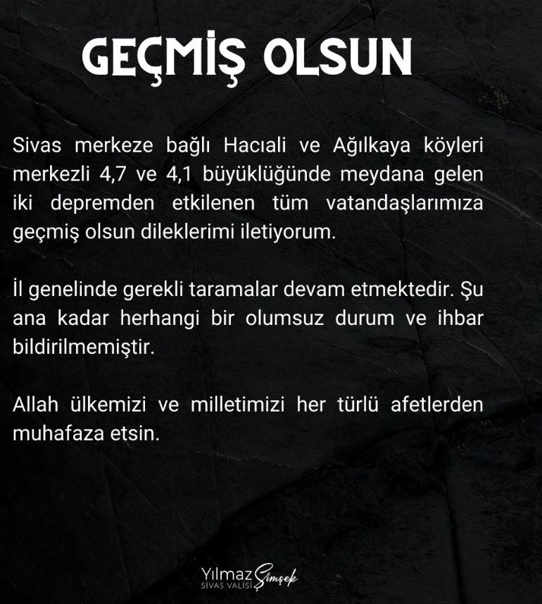 Sivas Valisi Yılmaz Şimşek Sivas'ta meydana gelen 4.7 ve 4.1 depremler sonrasında açıklama yaptı.