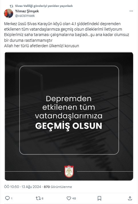 Vali Şimşek açıklamasında: "Merkez üssü Sivas Karayün köyü olan 4.1 şiddetindeki depremden etkilenen tüm vatandaşlarımıza geçmiş olsun dileklerimi iletiyorum