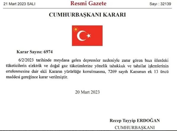6 Şubat 2023 tarihinde meydana gelen depremler nedeniyle zarar gören bazı illerdeki tüketicilerin elektrik ve doğal gaz tüketimlerine yönelik tahakkuk ve tahsilat işlemlerinin ertelenmesine dair karar kararı içerek Resmi Gazete yayımlandı. -internethaber