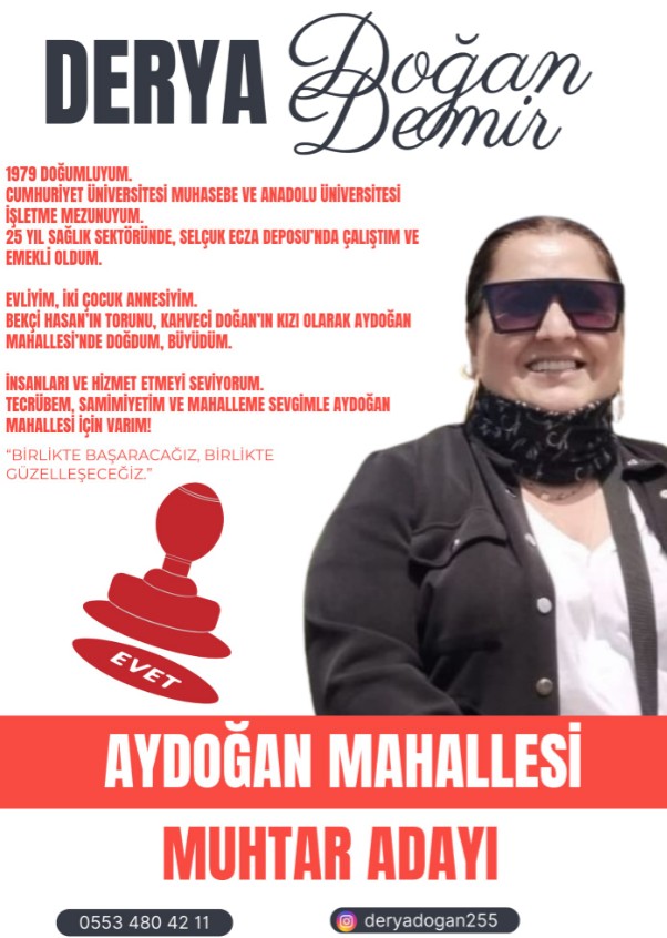 1979 yılında Sivas’ta doğan Derya Demir Doğan, Aydoğan Mahallesi Muhtarlığı için adaylığını açıkladı. Cumhuriyet Üniversitesi Muhasebe ve Anadolu Üniversitesi İşletme bölümlerinden mezun olan Doğan, 2000 yılından itibaren görev yaptığı Selçuk Ecza Deposu’ndaki çalışma hayatını tamamlayarak emekli oldu.
