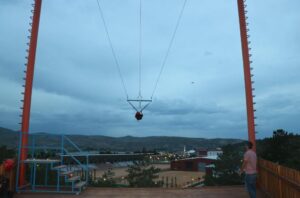 Motor yardımıyla zirvesi 11 metre yüksekliğe sahip olan ama insanların isteğine göre yukarı kaldırıyoruz. Serbest bıraktığımız zaman mekanizmayla birlikte ileriye açılarak adrenalin dolu anlar oluyor.