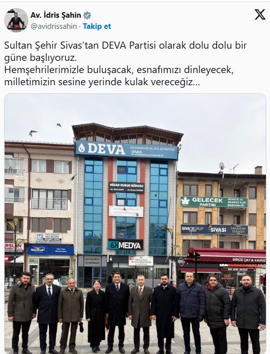 Programla ilgili sosyal medya hesabından açıklama yapan İdris Şahin, Sivas’ta yoğun bir gün geçireceklerini belirterek, “Sultan Şehir Sivas’tan DEVA Partisi olarak dolu dolu bir güne başlıyoruz. Hemşehrilerimizle buluşacak, esnafımızı dinleyecek ve milletimizin sesine yerinde kulak vereceğiz” ifadelerini kullandı.