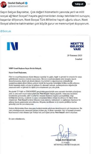 MHP’den yapılan açıklamada, “T3 Vakfı Mütevelli Heyeti Başkanı Sayın Selçuk Bayraktar’ın, yerli ve yeni nesil dijital dünya ağımız NEXT SOSYAL’e katılmaları için Genel Başkanımız Sayın Devlet Bahçeli’ye gönderdikleri davete icabeten, Sayın Genel Başkanımız NEXT SOSYAL ailesine dahil olmuştur” ifadelerine yer verildi.