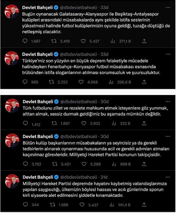 Bahçeli, "Türkiye'miz son yüzyılın en büyük deprem felaketiyle mücadele halindeyken Fenerbahçe-Konyaspor futbol müsabakası esnasında tribünden istifa sloganlarının atılması sorumsuzluk ve şuursuzluktur" dedi.