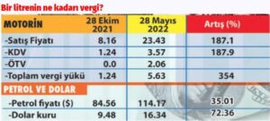 Benzin, motorin ve LPG'deki her zamdan devlet de kazanıyor. Bunun sebebi de akaryakıtta uygulanan KDV ve ÖTV oranları. Son 7 ayda dolar kuru yüzde 72, petrol fiyatları yüzde 35, akaryakıt fiyatları da yüzde 197 arttı. Benzin ve motorindeki kallavi zamlarla devletin vergi kazancı katlandı. Devletin benzin, motorin ve LPG üzerinden aldığı ÖTV ve KDV kazancı 7 ay içinde tam 5 kat yani yüzde 395 arttı. Zamlardan önce hükümet her 100 liralık benzinden 15 lira vergi alıyordu. Şimdi 25 lira alıyor. Devletin akaryakıttan 4 aylık vergi kazancı 5 milyar liraydı, şimdi 22.5 milyar lira oldu.