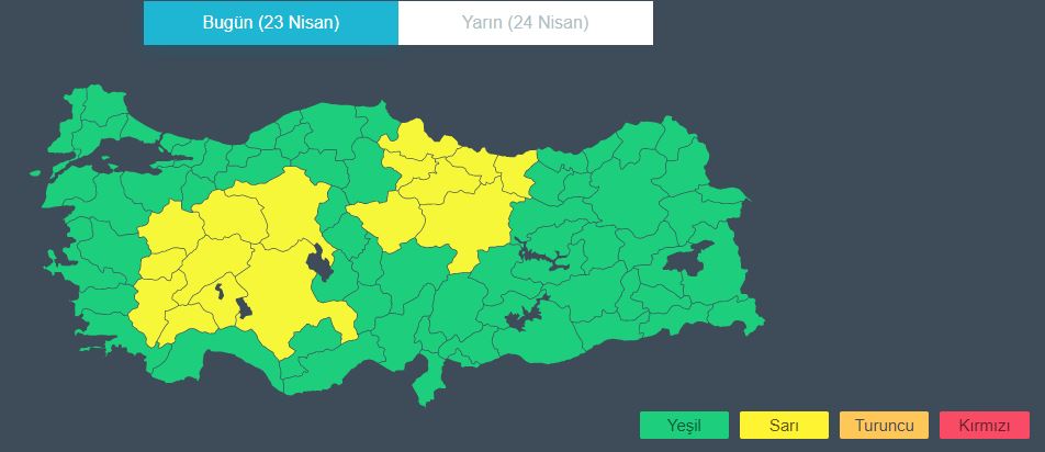 Yurdun batı bölgelerinde bugün 12.00-20.00 saatlerinde görülecek gök gürültülü sağanağın öğle ve akşamın ilk saatlerinde İç Ege (Kütahya, Afyonkarahisar, Denizli, Uşak), Göller Yöresi (Isparta ve Burdur) ile Eskişehir'in güney ve doğu, Ankara'nın güney ve batı, Konya'nın kuzey ilçelerinde yerel kuvvetli olacağı tahmin ediliyor.