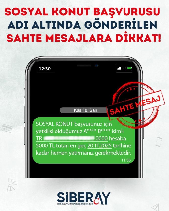 Son günlerde bazı vatandaşlara, “Sosyal konut başvurunuz onaylandı”, “Tıklayıp işlemi tamamlayın” gibi ifadeler içeren mesajlar ulaştığı, bu mesajların içinde ise kişisel bilgileri ele geçirmeye yönelik zararlı bağlantıların yer aldığı tespit edildi.