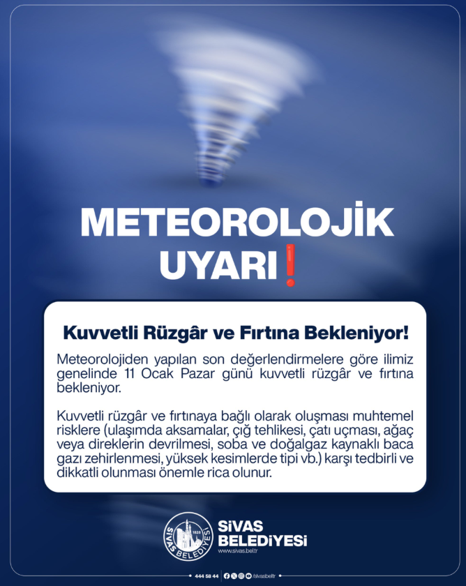 Meteoroloji yetkililerinden alınan bilgilere göre, 11 Ocak Pazar günü Sivas genelinde kuvvetli rüzgâr ve fırtına bekleniyor. Sivas Belediyesi tarafından yapılan uyarıda, rüzgârın zaman zaman fırtına şeklinde etkisini artırabileceği belirtilerek vatandaşların dikkatli ve tedbirli olması istendi.
