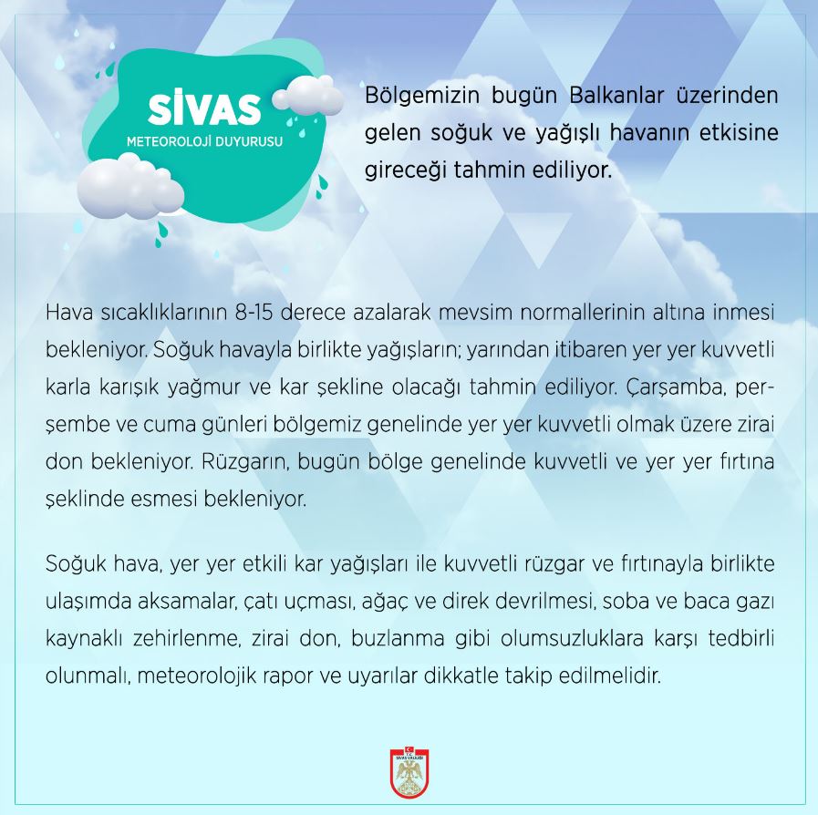 Sivas Valiliği tarafından yapılan açıklamada: "Meteoroloji Duyurusu 🌧️🍃