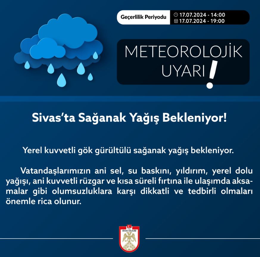 "Yapılan son değerlendirmelere göre; Bugün öğle saatlerinden itibaren Sivas'ın kuzey (Merkez, Yıldızeli, Hafik, Doğanşar, Zara, Koyulhisar, Suşehri, Akıncılar, Gölova, İmranlı) kesimlerinde aralıklı ve yerel olmak üzere kuvvetli gök gürültülü sağanak yağış beklendiğinden yaşanabilecek olumsuzluklara karşı dikkatli ve tedbirli olunması gerekmektedir." ifadelerine yer verildi.