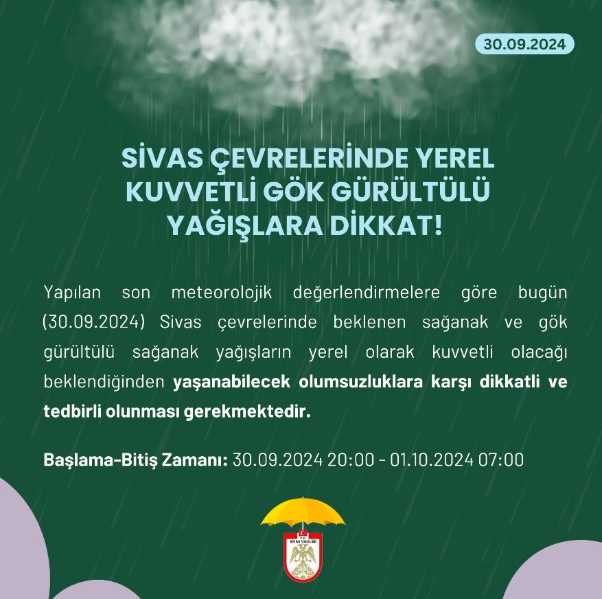 Valilik tarafından yapılan paylaşımda: "Sivas çevrelerinde yerel kuvvetli gök gürültülü yağışlara dikkat!" ifadelerine yer verdi.