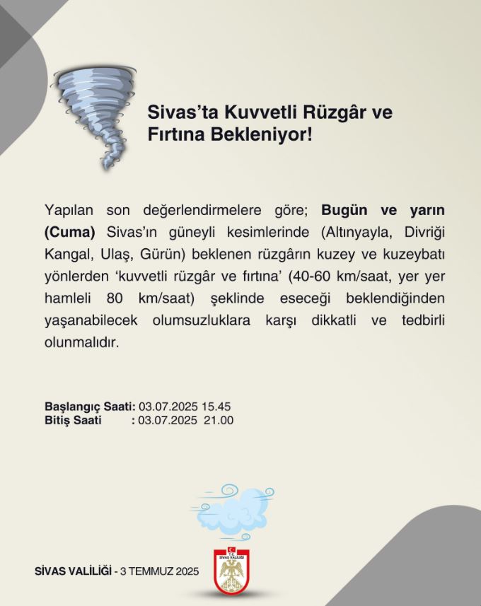 Yapılan son meteorolojik değerlendirmelere göre, bugün ve yarın (Cuma) özellikle Sivas’ın güney ilçeleri olan Altınyayla, Divriği, Kangal, Ulaş ve Gürün’de rüzgârın kuzey ve kuzeybatı yönlerden esmesi ve saatte 40-60 kilometre hızla, yer yer ise 80 kilometreyi bulan hamlelerle fırtına şeklinde etkili olması bekleniyor.