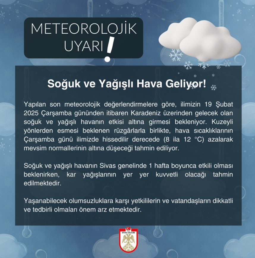 Sivas Valiliği, yapılan son meteorolojik değerlendirmelere göre 19 Şubat 2025 Çarşamba gününden itibaren Karadeniz üzerinden gelen soğuk ve yağışlı havanın il genelinde etkili olacağını duyurdu.