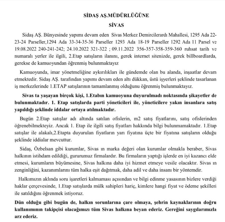 "Özbelsan ve Sidaş, Sivas'ın gururu ve göz bebeği kurumladır. Onların zenginliği, Sivas'ın zenginliğidir. Eski sanayide yapılan iş merkezlerinde 1. etap duyurulmadan satıldığına dair iddialar var.