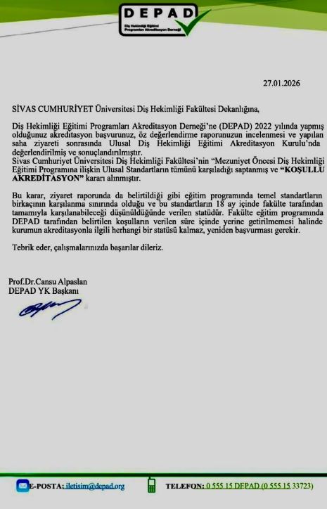 DEPAD tarafından yapılan açıklamada, Diş Hekimliği Fakültesi’nin ilgili eğitim programının ulusal standartların tamamını karşıladığı, bazı temel standartların ise geliştirilme aşamasında olduğu belirtildi. Belirlenen koşulların 18 ay içerisinde tamamlanması halinde akreditasyon sürecinin kesintisiz şekilde devam edeceği ifade edildi.