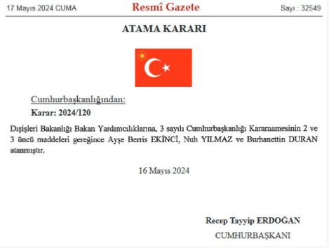 Ayşe Berris Ekinci, Nuh Yılmaz ve Burhanettin Duran Dışişleri Bakan Yardımcısı olarak atanmasına dair karar Resmi Gazete'de yayınlandı.