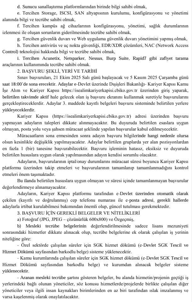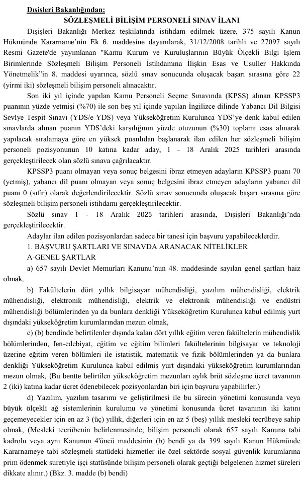 Dışişleri Bakanlığı, merkez teşkilatında görevlendirilmek üzere 22 sözleşmeli bilişim personeli alımı yapacağını duyurdu.