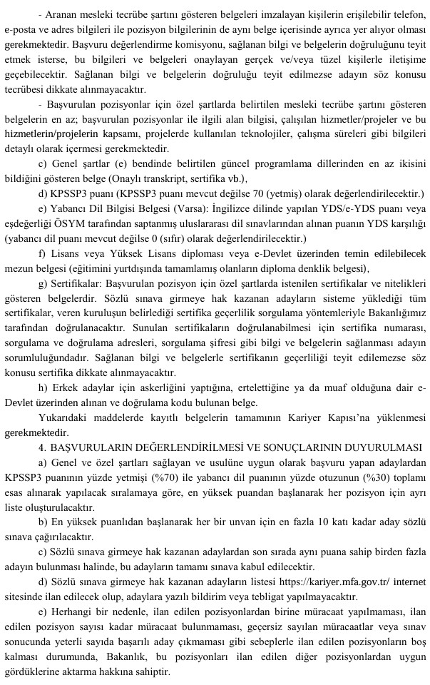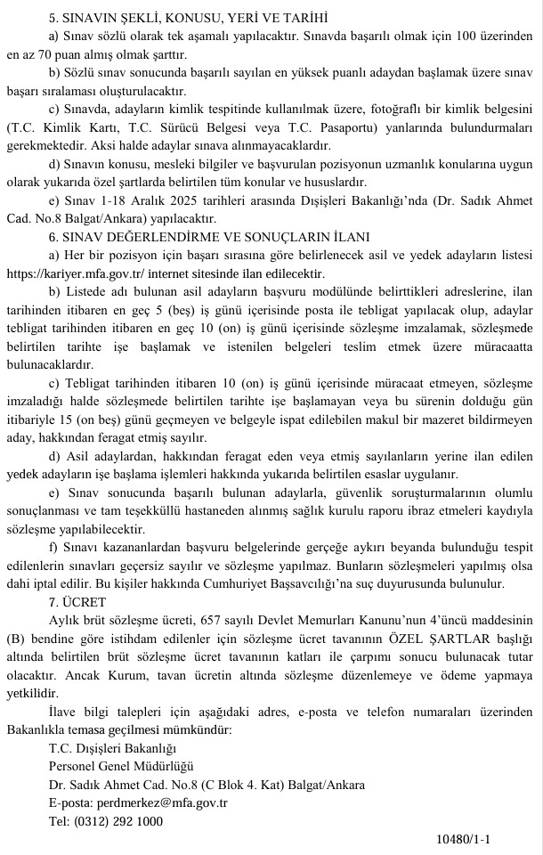 Sözlü sınav sonucuna göre başarı sırasına giren adaylar arasından 22 sözleşmeli bilişim personeli Dışişleri Bakanlığı bünyesinde görevlendirilecek.