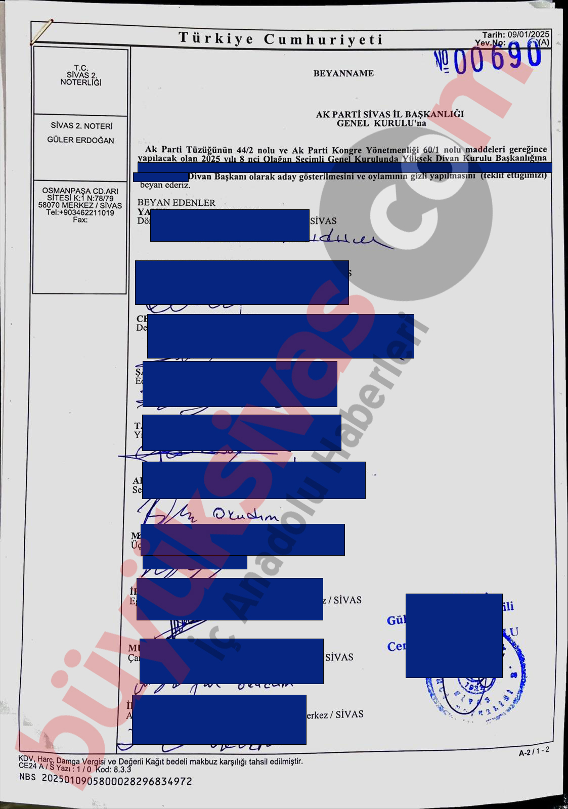 11 Ocak'ta yapılması planlanan AK Parti Sivas 8. Olağan İl Kongresi öncesinde delegeler, Divan Başkanlığı için noter huzurunda imza vermeye devam ediyor. Kongre süreci, AK Parti tüzüğünün 44. maddesine uygun olarak ilerliyor.