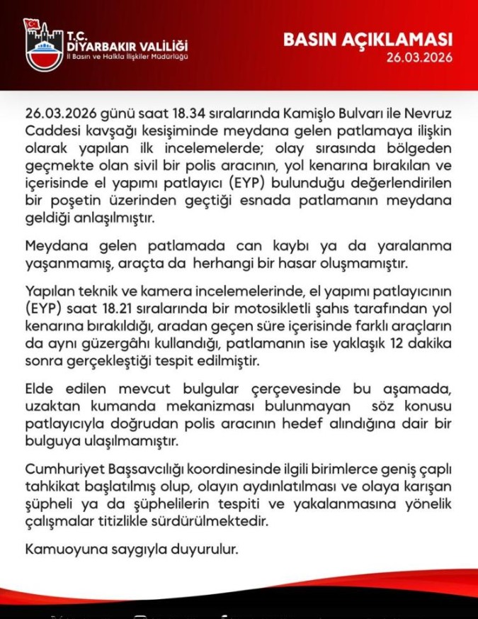 Diyarbakır Valiliği tarafından yapılan açıklamaya göre, olay 26 Mart günü saat 18.34 sıralarında Kamişlo Bulvarı ile Nevruz Caddesi kavşağında meydana geldi. İlk incelemelerde, bölgeden geçmekte olan sivil polis aracının, içerisinde EYP bulunduğu değerlendirilen bir poşetin üzerinden geçtiği sırada patlamanın gerçekleştiği tespit edildi.