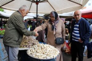 Mesut Karaömeroğlu isimli Pazar müşterisi, sarımsağın fiyatının düştüğünü ifade ederek, “Üretimin bolluğundan dolayı sarımsak fiyatları düştü. Sarımsağın her türlü faydası vardır, doğal antibiyotiktir ilaç kullanacağına sarımsak kullan” şeklinde konuştu.