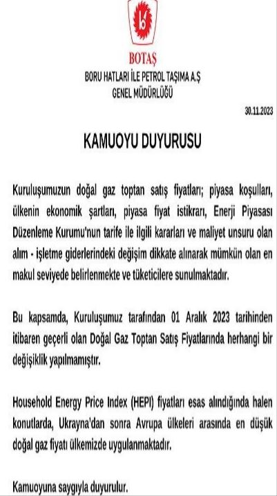 Kurumun internet sitesinde yer alan duyuruda, "Household Energy Price Index (HEPI) fiyatları esas alındığında halen konutlarda, Ukrayna'dan sonra Avrupa ülkeleri arasında en düşük doğal gaz fiyatı ülkemizde uygulanmaktadır." ifadesi kullanıldı.