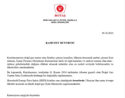 Boru Hatları ile Petrol Taşıma A.Ş (BOTAŞ), kasım ayı itibarıyla mesken ve sanayi abonelerinin kullandığı doğalgazın satış tarifesinde herhangi bir değişiklik yapılmadığını duyurdu.