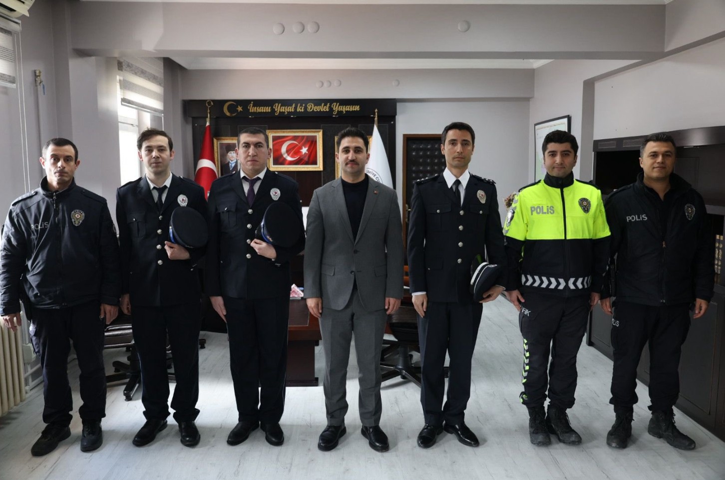 İlçe Emniyet Amiri Başkomiser Faruk Yıldırım ve beraberindeki emniyet personeli, Kaymakam Muhammed Yavuz’u makamında ziyaret ederek Polis Haftası kapsamında gerçekleştirilen etkinlikler hakkında bilgi verdi. Ziyaret sırasında ilçede yürütülen güvenlik hizmetleri ve asayiş çalışmaları da değerlendirildi.